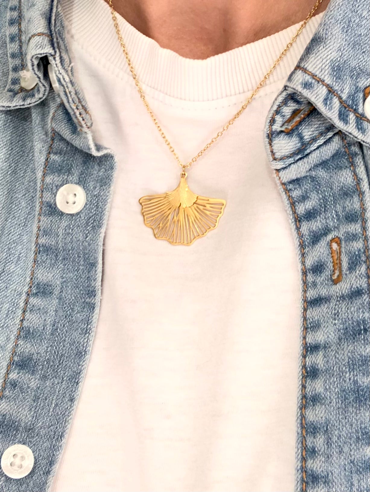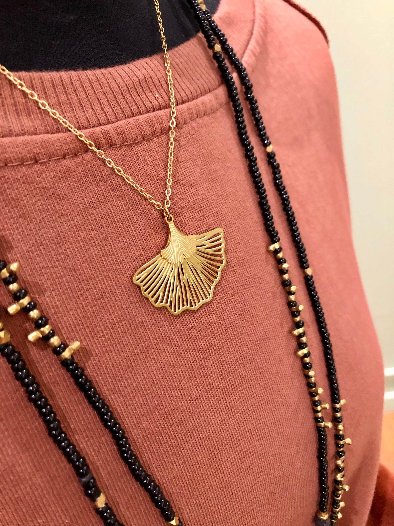 Collier double pendentif Ginkgo filigrane – Acier inoxydable doré